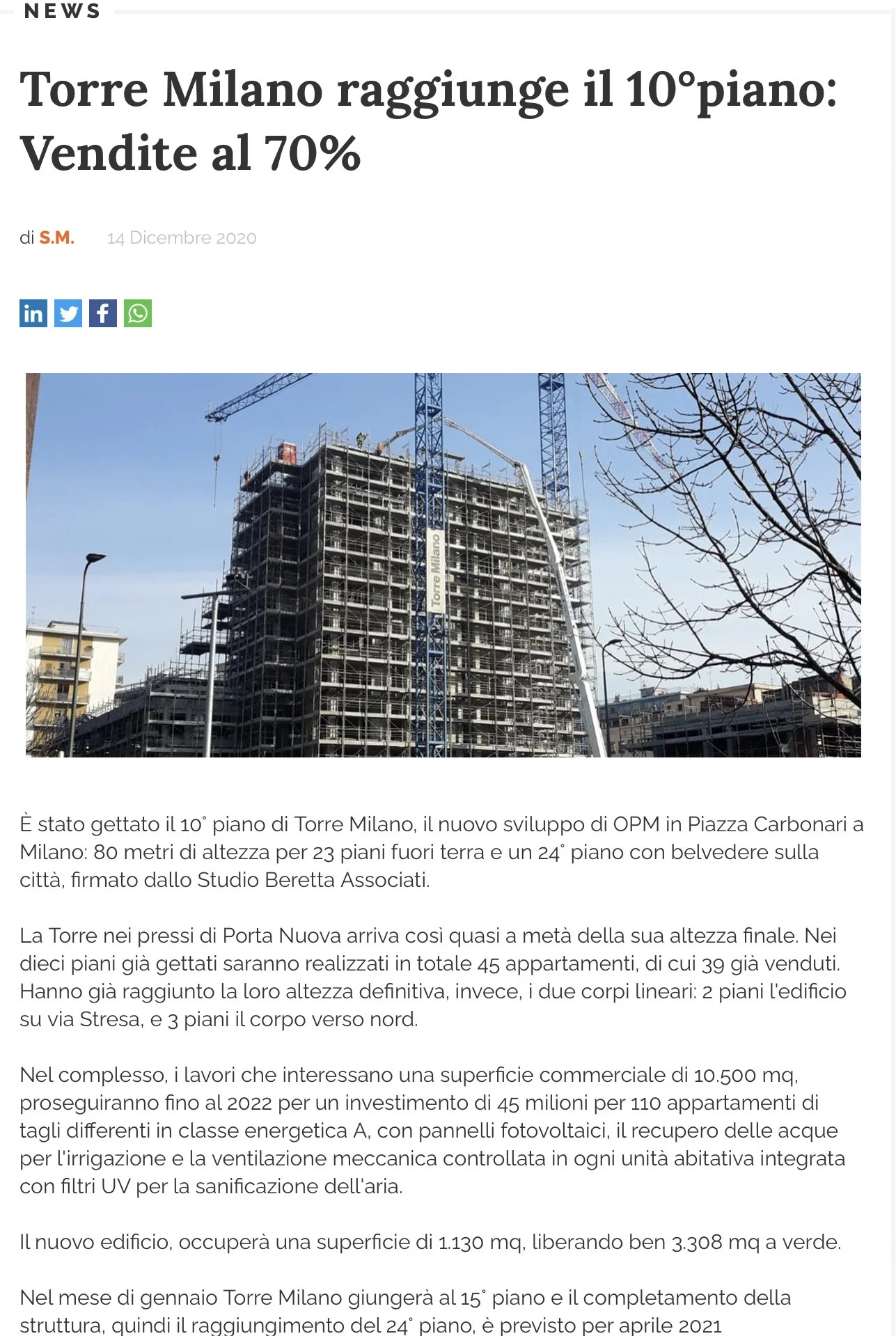 Torre Milano raggiunge il 10 piano. Vendite al 70%