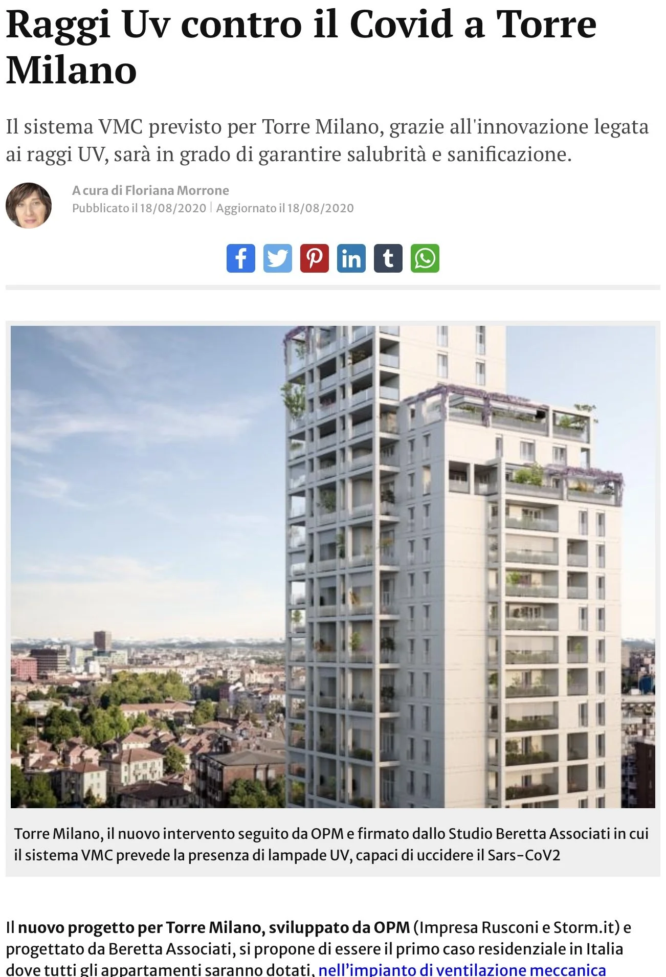 Il sistema VMC previsto per Torre Milano, grazie all'innovazione legata ai raggi UV, sarà in grado di garantire salubrità e sanificazione.